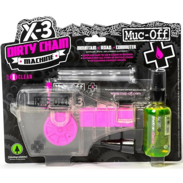 Le Dirty Chain Machine X3 bénéficie de l’expérience Muc-Off pour apporter le produit le plus abouti du marché! Il nettoie en quelques secondes votre chaine grace à son produit nettoyant qui peut être envoyé en spray puis réutilisé dans son carter bas. Les brosse nettoyantes ont 120 points de contacts et n’oublient aucun point de crasse. Le liquide de nettoyage usé pars dans un second reservoir pour ne pas salir a nouveau la chaîne propre. Pour finir il utilise notre Drivetrain cleaner bio et est donc non nocif pour l’environnement si vous utilisez aussi nos lubrifiants pour chaine biodégradable.